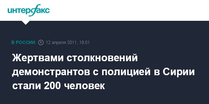 Дамаск. 12 апреля. INTERFAX.RU - Число погибших в ходе столкновений демонстрантов с полицией в Сирии достигло 200 человек, говорится в заявлении ведущей правозащитной организации в Сирии "Дамасская декларация".