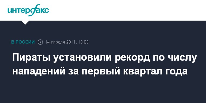 Санкт-Петербург. 14 апреля. INTERFAX.RU - За первый квартал 2011 год число нападений пиратов на гражданские суда достигло рекордной отметки, сообщает сайт Российского профсоюза моряков в четверг со ссылкой на Международное морское бюро (ММБ).