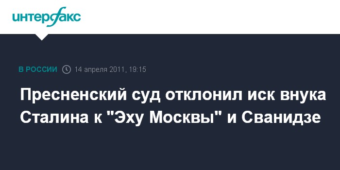 Москва. 14 апреля. INTERFAX.RU- Пресненский суд Москвы отказался удовлетворить иск внука Иосифа Сталина Евгения Джугашвили о защите чести и достоинства своего деда к радиостанции "Эхо Москвы" и Николаю Сванидзе с требованием компенсации морального вреда в 11 млн рублей.