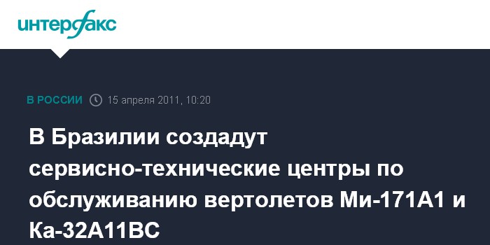 Рио-де-Жанейро (Бразилия). 15 апреля. INTERFAX.RU - Холдинг "Вертолеты России" подписал на выставке LAAD 2011 в Рио-де-Жанейро соглашения по созданию сервисно-технических центров по обслуживанию вертолетов Ми-171А1 и Ка-32А11ВС