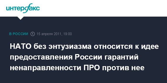 Берлин. 15 апреля. INTERFAX.RU - В НАТО не проявляют энтузиазма касательно инициативы о предоставлении России юридических гарантий того, что создаваемая система ПРО не направлена против РФ.