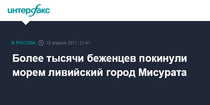 Женева. 15 апреля. INTERFAX.RU - Судно Международной организации по миграции (МОМ) эвакуировало около 1,2 тыс. беженцев из ливийского города-порта Мисураты, сообщает в пятницу агентство ЭФЭ со ссылкой на представителей организации.