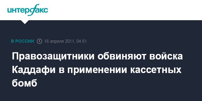 Лондон. 16 апреля. ИНТЕРФАКС - Международная правозащитная организация Human Rights Watch обвинила проправительственные силы Ливии в использовании запрещенных во многих странах кассетных бомб.