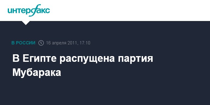 Лондон. 16 апреля. INTERFAX.RU - Высший административный суд Египта в субботу принял решение о ликвидации Национально-демократической партии Египта, сообщает британская телерадиовещательная корпорация Би-Би-Си. Эта партия была правящей при экс-президенте Хосни Мубараке. Суд также принял постановление о передаче всего имущества и средств ликвидированной партии в распоряжение государства.