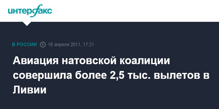 Брюссель. 16 апреля. INTERFAX.RU - После перехода к НАТО командования военными операциями международных сил в Ливии самолеты коалиции совершили 2 тысячи 583 вылета, сообщила в субботу штаб-квартира Североатлантического альянса в Брюсселе. 1 тысяча 87 вылетов были боевыми. В пятницу, 15 апреля, натовская авиация совершила 145 вылетов, из них 58 - боевые, сообщается в ежедневной сводке альянса.