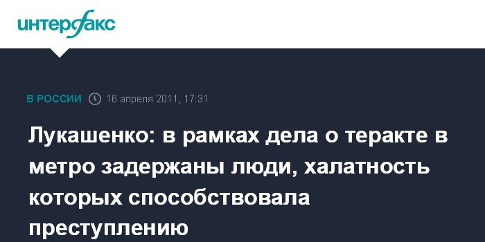 Минск. 16 апреля. INTERFAX.RU - В ходе расследования взрыва в минском метро задержаны люди, халатность которых сделала возможным эту трагедию, сообщил президент Белоруссии Александр Лукашенко. "Если бы не головотяпство отдельных, мы бы их (подозреваемых во взрыве - "ИФ") задержали раньше, еще по взрыву 3 июля (2008 года - "ИФ")", - заявил А.Лукашенко журналистам в субботу в Минске. "Есть факты, в ближайшее время скажем, как это стало возможно, и там есть элемент полнейшей расхлябанности. Кого? В ближайшее время скажем. Они задержаны, я сказал их допрашивать, как преступников", - сказал А.Лукашенко.