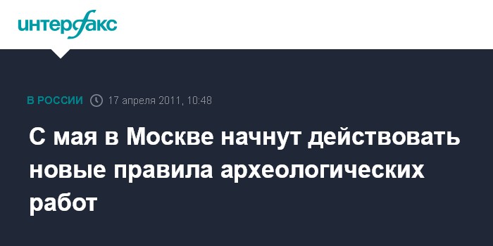 Москва. 17 апреля. INTERFAX.RU - Новые правила проведения археологических работ в Москве вступят в силу в мае, сообщил "Интерфаксу" руководитель департамента культурного наследия столицы Александр Кибовский. "С началом полевого сезона в этом году начнут действовать новые правила археологических исследований", - заявил А.Кибовский.