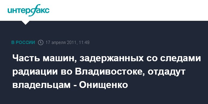 Москва. 17 апреля. INTERFAX.RU - На половине "фонящих" машин, ввезенных из Японии во Владивосток, пропали следы радиации, и они могут быть переданы владельцам, сообщил "Интерфаксу" в воскресенье руководитель Роспотребнадзора, главный государственный санитарный врач РФ Геннадий Онищенко. "На 20 машинах, которые были контаминированы короткоживущими радионуклидами, уровень радиации упал. Сейчас решается вопрос об их выдаче владельцам", - сказал Г.Онищенко.