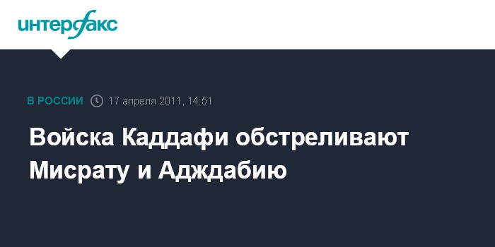 Лондон. 17 апреля. INTERFAX.RU - Ливийские повстанцы утверждают, что артиллерия полковника Каддафи обстреляла в воскресенье город Мисрата, убив, по меньшей мере, шесть мирных жителей, передает корпорация BBC. Этот оплот оппозиции на западе страны уже несколько недель находится в осаде. Очевидцы сообщают также, что войска, верные ливийскому лидеру, ведут огонь по повстанцам в районе восточного города Адждабия. Местный житель рассказал, что видел десятки снарядов, разорвавшихся у западного въезда в город. "В Адждабии все еще остаются повстанцы, но в районе западного въезда ситуация накалена", - сказал очевидец.