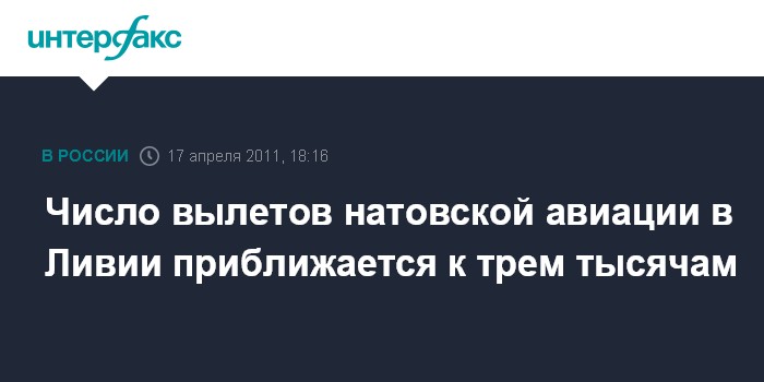 Брюссель. 17 апреля. INTERFAX.RU - Военные самолеты международной коалиции в Ливии после перехода командования операциями к Североатлантическому альянсу 31 марта совершили 2734 вылета, сообщила в воскресенье штаб-квартира НАТО в Брюсселе. В ежедневной сводке альянса отмечается, что 1146 вылетов были боевыми. 16 апреля осуществлено 144 вылета, из которых 42 - боевые, сообщает НАТО.