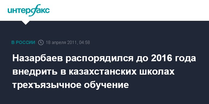 Астана. 18 апреля. ИНТЕРФАКС-КАЗАХСТАН - В Казахстане до 2016 года должно быть внедрено обучение в школах на трех языках, заявил президент Нурсултан Назарбаев.