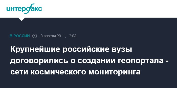 Москва. 16 апреля. INTERFAX.RU – Российские вузы, в том числе Московский государственный университет имени Ломоносова, Санкт-Петербургский госуниверситет, Кабардино-Балкарский госуниверситет, Сибирский федеральный университет, Южный федеральный университет подписали соглашение об образовании консорциума "Университетские геопорталы".