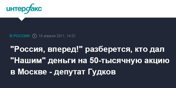 Москва. 18 апреля. INTERFAX.RU - Движение "Россия, вперед!" намерено выяснить, в какую сумму обошлась проведенная прокремлевским движением "Наши" многотысячная акция в Москве 16 апреля и из каких источников были взяты эти деньги, сообщил "Интерфаксу" лидер движения "Россия, вперед!", депутат Госдумы Геннадий Гудков ("Справедливая Россия").