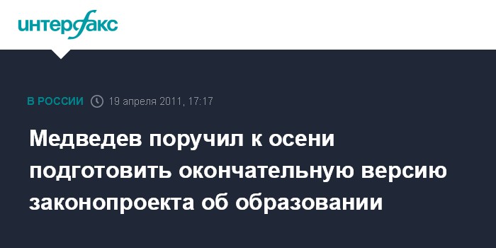 Горки. 19 апреля. INTERFAX.RU - Окончательный вариант нового закона об образовании должен быть готов к осени, заявил президент РФ Дмитрий Медведев на встрече с главой Минобрнауки Андреем Фурсенко.