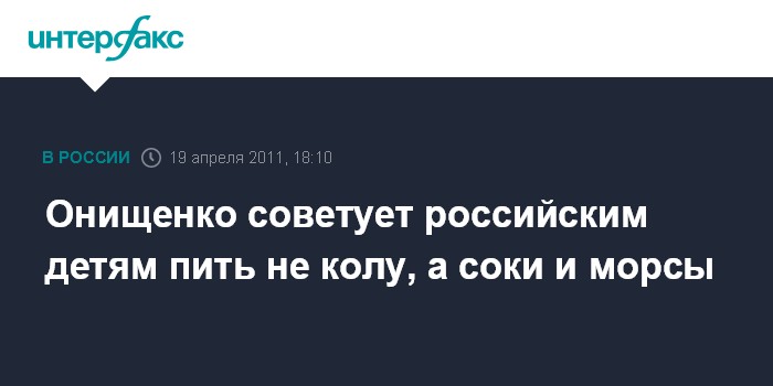 Москва. 19 апреля. INTERFAX.RU - Руководитель Роспотребнадзора, главный государственный санитарный врач РФ Геннадий Онищенко считает, что детям в России полезнее пить не газированные напитки, а традиционные соки и морсы.