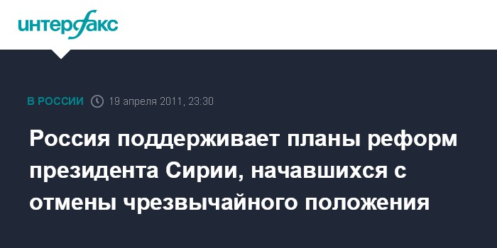 "Не так давно президент Дмитрий Медведев разговаривал с президентом Асадом (президентом Сирии Башаром Асадом - ИФ). Когда президент Сирии объявил о планах проведения реформ, с нашей стороны прозвучала активная поддержка этих планов. Мы рады, что они начинают реализовываться на практике", - сказал С.Лавров на пресс-конференции во вторник в Подгорице (Черногория).