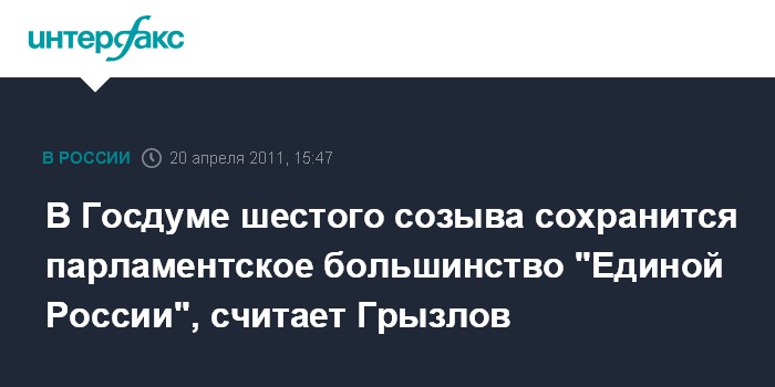 Москва. 20 апреля. INTERFAX.RU - Председатель Высшего совета "Единой России", спикер Госдумы Борис Грызлов уверен, что по итогам декабрьских выборов в Госдуму "единороссы" сохранят за собой контроль в нижней палате парламента.