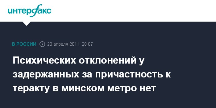 Минск. 20 апреля. INTERFAX.RU - Правоохранительные органы Белоруссии пришли к выводу об отсутствии оснований для заключения о психических отклонениях задержанных за совершение теракта в минском метро 11 апреля.