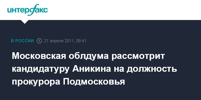 "Рассмотрение депутатами кандидатуры Аникина намечено на 11:00. Представлять его будет Генпрокурор России Чайка", - сообщили "Интерфаксу" накануне в аппарате Московской областной думы.