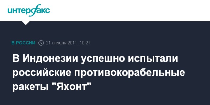 "ВМС Индонезии сегодня провели успешные стрельбы ракетой "Яхонт" российского производства и поразили старый корабль-цель", - заявил журналистам на борту флагмана адмирал Искандер Ситомпул.