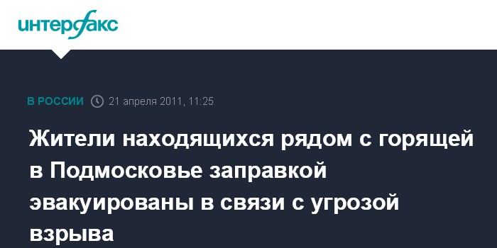 Москва. 21 апреля. INTERFAX.RU - На газонаполнительной станции в подмосковном Одинцово, где в четверг произошел пожар, может взорваться вторая цистерна, сообщил "Интерфаксу" источник в правоохранительных органах.