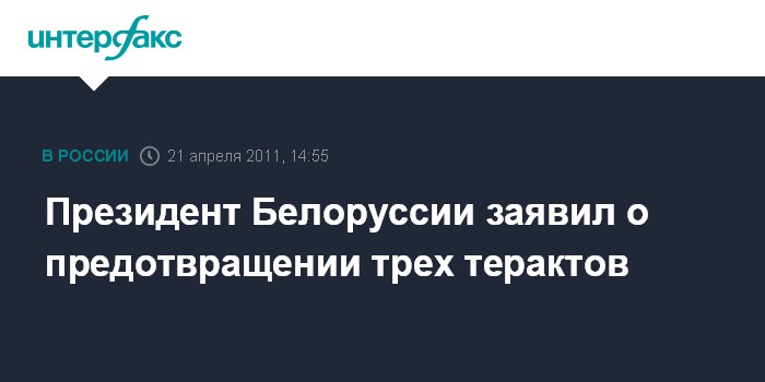 Минск. 21 апреля. INTERFAX.RU - Президент Белоруссии Александр Лукашенко, обращаясь в четверг к народу и парламенту страны с ежегодным посланием, сообщил о предотвращении правоохранительными органами трех терактов.