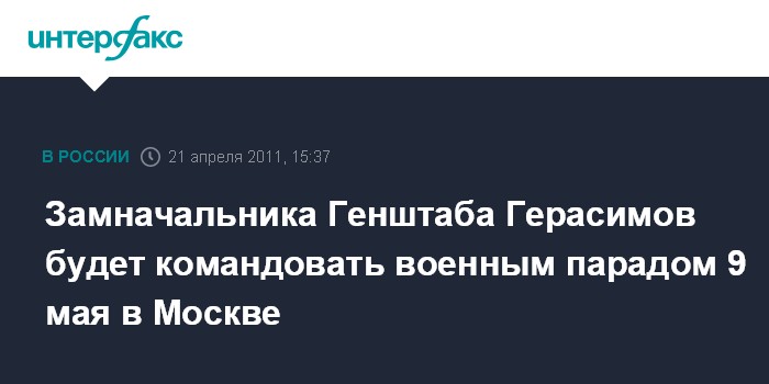 Москва. 21 апреля. INTERFAX.RU - Командовать Парадом Победы на Красной площади будет заместитель начальника Генштаба Вооруженных сил генерал-полковник Валерий Герасимов, сообщил в четверг "Интерфаксу-АВН" официальный представитель Минобороны РФ полковник Игорь Конашенков.