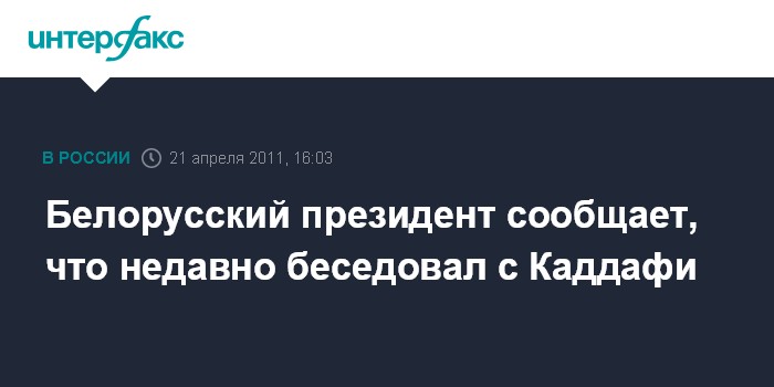 Белорусский президент воспроизвел свой диалог с Каддафи: "Я ему задал вопрос: "Слушай, что у тебя там происходит? От тебя там люди бегут, дипломаты. . ." Он засмеялся и говорит: "Господин президент, ну, вы мне верите? Ну, вы не то телевидение смотрите". Лукашенко продолжил: "Ну, я ему говорю: у нас только это телевидение. К сожалению, у нас ливийское не идет".