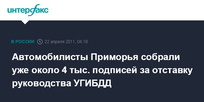 Владивосток. 22 апреля. ИНТЕРФАКС-ДАЛЬНИЙ ВОСТОК - В Приморье на специально открытом Интернет-сайте за три дня собрано около 4 тыс. подписей автомобилистов края под обращением к руководству страны с просьбой отправить в отставку начальников местного УГИБДД,