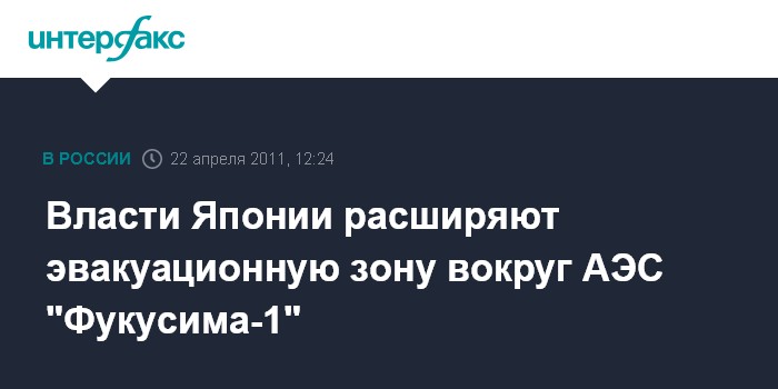 Токио. 22 апреля. INTERFAX.RU - Власти Японии на 10 км расширили эвакуационную зону от аварийной АЭС "Фукусима-1", сообщает в пятницу телекомпания NHK со ссылкой на генерального секретаря кабинета министров Юкио Эдано.