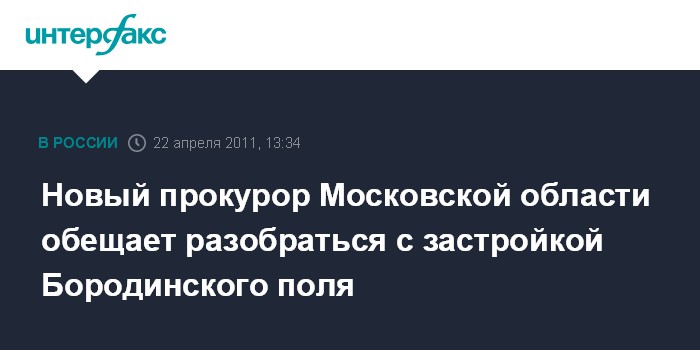 Москва. 22 апреля. INTERFAX.RU - Новый прокурор Подмосковья Александр Аникин заявил о необходимости изучить ситуацию с застройкой Бородинского поля. "Очень серьезно звучит тема Бородино, когда внезапно стали там появляться новостройки - 149 объектов. Наверное, нужно тоже нам внимательно к этой тематике подойти", - заявил Аникин журналистам в пятницу.
