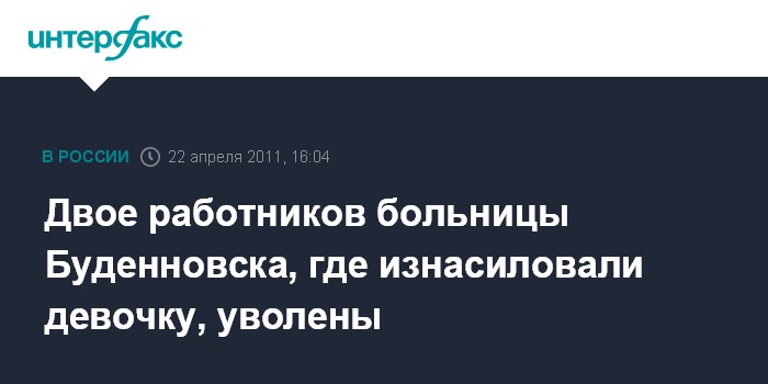 Пятигорск. 22 апреля.INTERFAX.RU - По итогам проверки Министерства здравоохранения Ставропольского края в больнице Буденновска, где была изнасилована десятилетняя девочка, двое работником медучреждения уволены, пять человек привлечены к дисциплинарной ответственности.