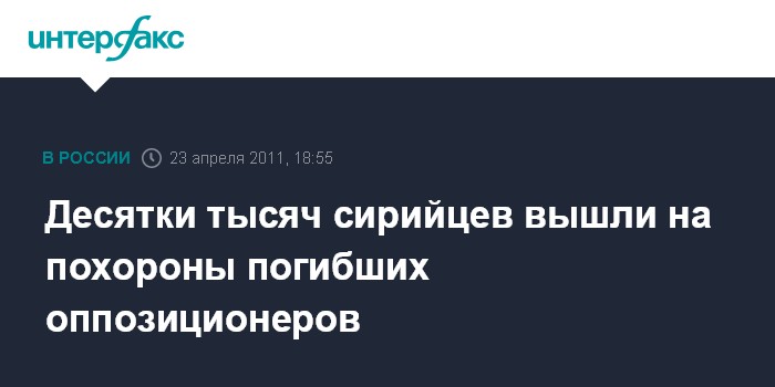 Лондон. 23 апреля. INTERFAX.RU - Несколько десятков тысяч человек вышли в субботу на улицы нескольких городов Сирии для участия в церемонии похорон оппозиционеров, погибших днем ранее в столкновениях с военными и полицейскими, сообщают британские СМИ.