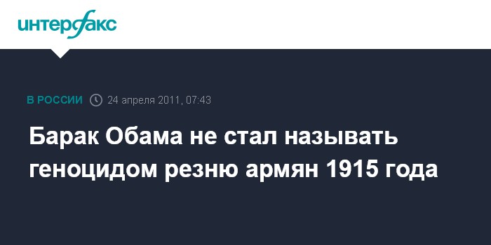 Вашингтон. 24 апреля. ИНТЕРФАКС - Президент США Барак Обама призвал вспомнить всех жертв Мец Егерна (в переводе с армянского - великая резня - "ИФ") армянского народа, произошедшего в 1915 году, говорится в его заявлении, распространенном в американской столице.