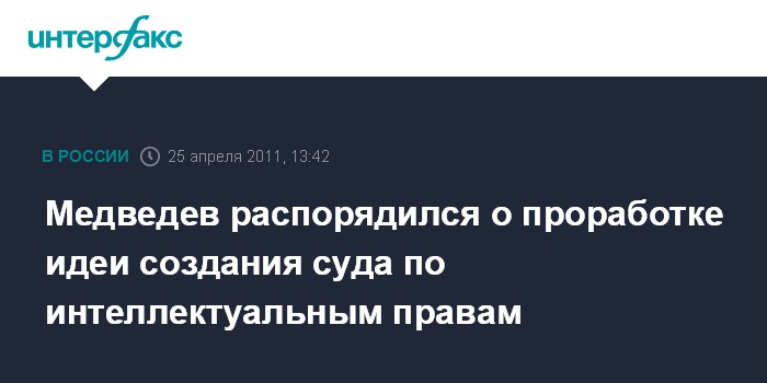 Москва. 25 апреля. INTERFAX.RU - Президент РФ Дмитрий Медведев поручил своей администрации совместно с судебным и экспертным сообществами проработать вопрос о создании специального суда по интеллектуальным правам.