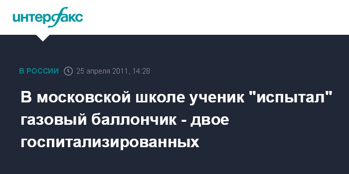 Москва. 25 апреля. INTERFAX.RU - Два школьника попали в больницу на западе Москвы с отравлением вследствие распыления газового баллончика, сообщил "Интерфаксу" источник в правоохранительных органах в понедельник.