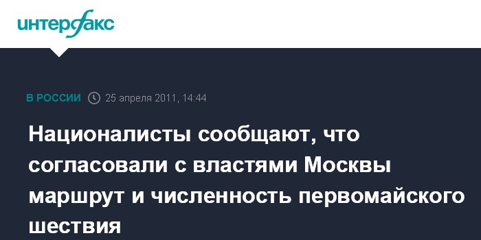Москва. 25 апреля. INTERFAX.RU - Националисты согласовали со столичными властями первомайскую акцию, по просьбе ГУВД изменен маршрут их шествия.