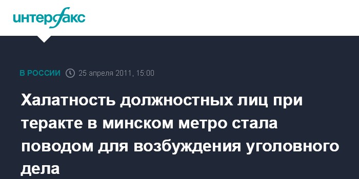 Минск. 25 апреля. INTERFAX.RU - В Белоруссии возбуждено уголовное дело по факту халатности должностных лиц в связи с терактом в минском метро, сообщил в понедельник глава МВД Анатолий Кулешов.