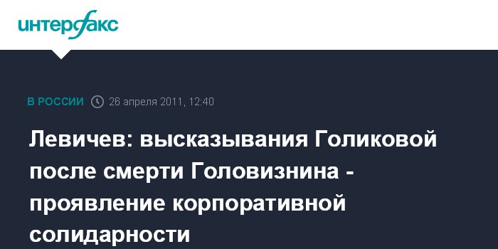 "Когда я вижу информацию о том, что судмедэкспертиза якобы установила, будто бы Максим скончался за два-четыре часа до того, как его доставили к воротам больницы (Института хирургии им. Вишневского - ИФ), когда я слышу слова Татьяны Алексеевны Голиковой, я понимаю: заработала система корпоративной солидарности, которая уже на всякий случай выдвигает боевые бастионы на передовую", - заявил журналистам во вторник Левичев.