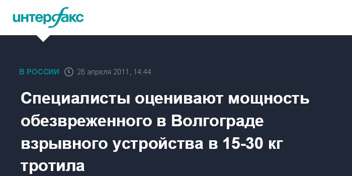 Волгоград. 26 апреля. INTERFAX.RU - Мощность взрывного устройства у здания академии МВД в Волгограде составляла от 15 до 30 кг в тротиловом эквиваленте, сообщила агентству "Интерфакс-Юг" представитель СУ СКР по региону Наталья Куницкая.