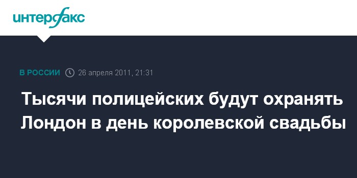 Лондон. 26 апреля. INTERFAX.RU - Около 5 тыс. полицейских будут обеспечивать безопасность Лондона в день свадьбы принца Уильяма и Кейт Миддлтон, сообщает во вторник британская телерадиокорпорация BBC.