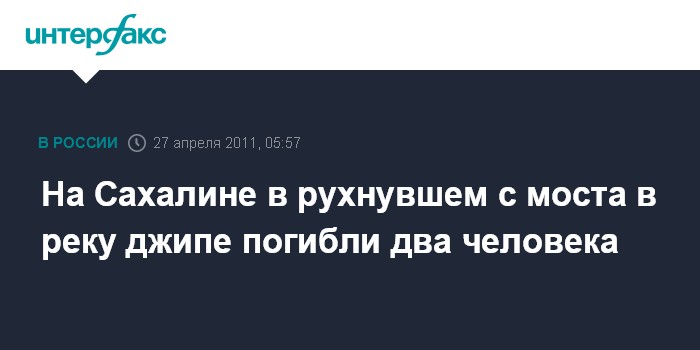 Южно-Сахалинск. 27 апреля. ИНТЕРФАКС - ДАЛЬНИЙ ВОСТОК - Двое сахалинцев погибли во вторник в упавшем в реку джипе, сообщает пресс-служба УГИБДД Сахалинской области.