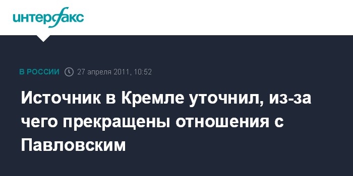 "Отношения прекращены. Но прекращены вовсе не из-за его каких-то высказываний. Помилуйте, никто не дает никаких обещаний или подписок по поводу того, что говорить, что не говорить", - сказал источник "Интерфаксу" в среду, комментируя сообщение газеты "Ведомости" о том, что Г.Павловского "отлучили от Кремля".