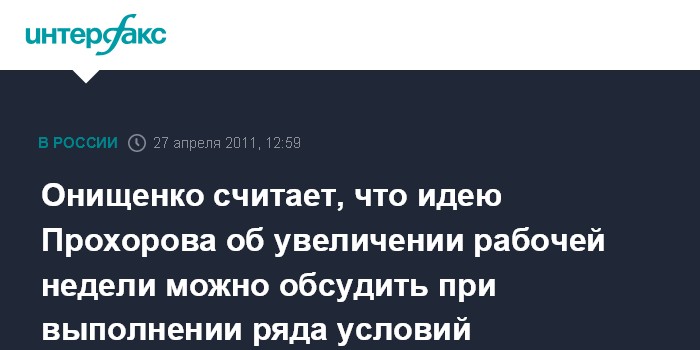 Москва. 27 апреля. INTERFAX.RU - Руководитель Федеральной службы по надзору в сфере защиты прав потребителей и благополучия человека (Роспотребнадзор) Геннадий Онищенко заявил, что инициатива бизнесмена Михаила Прохорова о 60-часовой рабочей неделе при ряде условий реализуема и нуждается в обсуждении.