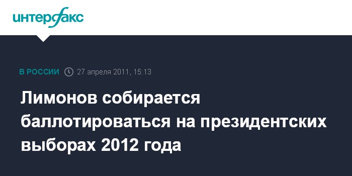 Москва. 27 апреля. INTERFAX.RU - Оппозиционер и писатель, лидер незарегистрированной партии "Другая Россия" Эдуард Лимонов намерен участвовать в предстоящих в 2012 году президентских выборах.