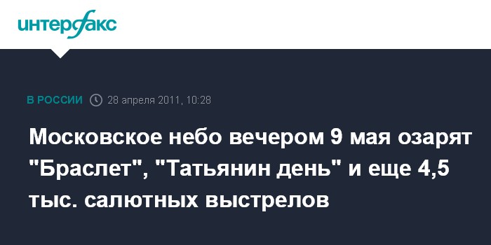 "Салют в Москве будет производиться с тринадцати точек, основной из которых является Поклонная гора. В нынешнем салюте будут применены ряд новых фейерверочных выстрелов - "Браслет", "Татьянин день" и другие ", - сообщил "Интерфаксу" в четверг официальный представитель управления пресс-службы и информации МО РФ по Сухопутным войскам подполковник Сергей Власов.