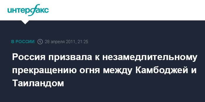 В ходе встреч и переговоров "с российской стороны (была) подчеркнута необходимость незамедлительного прекращения огня и запуска при поддержке АСЕАН эффективного диалога между Пномпенем и Бангкоком в целях скорейшего мирного решения территориальной проблемы", - говорится в сообщении МИД РФ, распространенном в Москве.