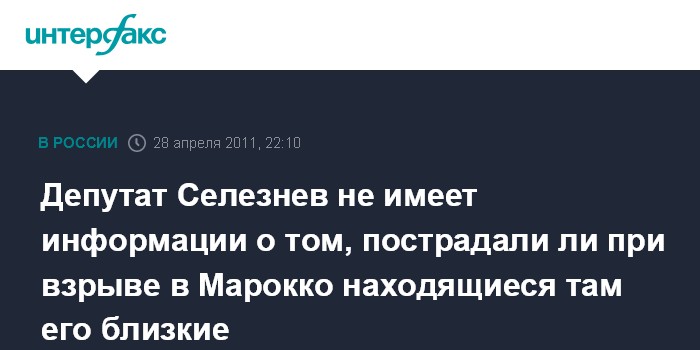 Москва. 28 апреля. INTERFAX.RU - Депутат Госдумы от ЛДПР Валерий Селезнев подтвердил, что в Марракеше находятся его сын и супруга сына, но не знает, пострадали ли они при взрыве.