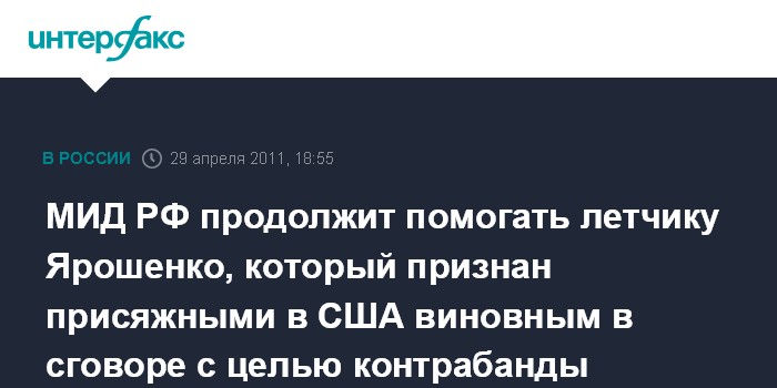 Москва. 29 апреля. INTERFAX.RU - Российскому летчику Константину Ярошенко, которого судят в США по делу о контрабанде наркотиков, продолжат оказывать консульскую и правовую помощь, сообщает МИД РФ