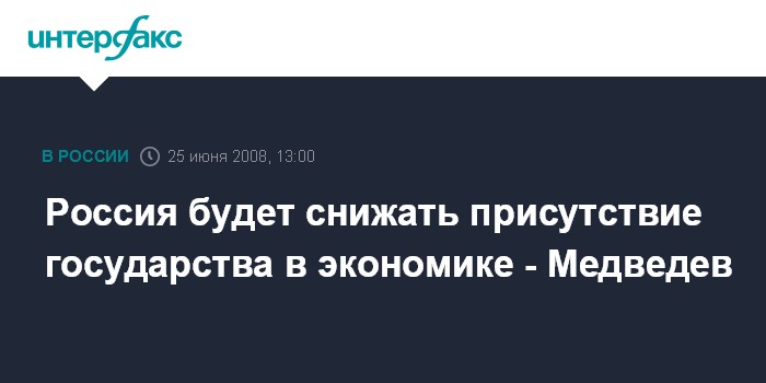 Москва. 25 июня. INTERFAX.RU - Российские власти будут принимать меры по сокращению присутствия государства в экономике, заявил президент РФ Дмитрий Медведев. "В настоящий момент, на мой взгляд, нет никаких оснований говорить об укреплении, дополнительном укреплении присутствия государства в (российской) экономике. Государство в этом не заинтересовано", - сказал Медведев в интервью журналистам, текст которого распространен пресс-службой Кремля. Напротив, по его словам, российские власти продолжают политику приватизации ряда активов, которая началась еще больше 10 лет назад.